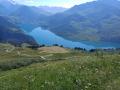 3ème jour, lundi – La crête du lac de Roselend via la roche Parstire en boucle, accompagnateurs : Sylvie et Juliette. Départ du col du Pré par une route très sinueuse, étroite et vertigineuse. Deux groupes au départ du même circuit, direction la roche Parstire par un chemin boisé à forte pente, mais régulière. Nous arrivons aux pieds des roches avec une vue magnifique sur le lac de Roselend. Nous reprenons notre ascension, arrivée au sommet, un chemin en crête nous conduit au passage « Charmette ». Là les deux groupes se séparent, l’un pour redescendre directement et l’autre pour aller vers les « Acrays » par la Faitaz où nous traversons un très beau troupeau de Tarines. Pose repas en surplombant le lac de St Guérin. Nous regagnons les voitures par les « ravines rouges » et le sentier « découverte ».