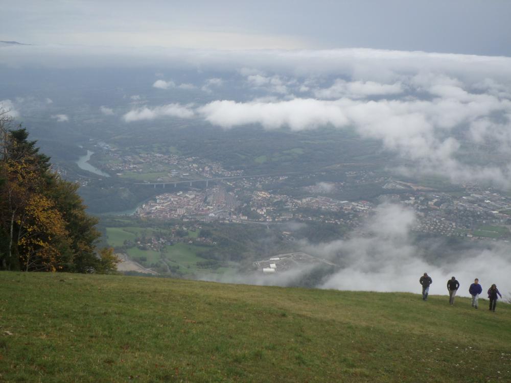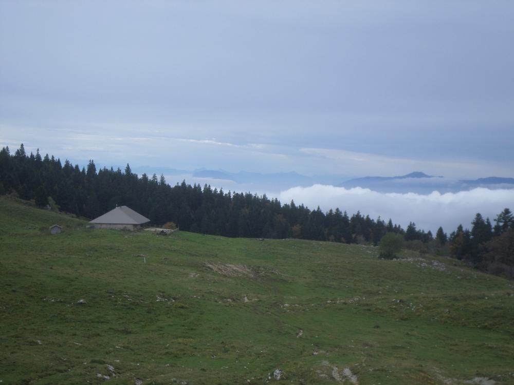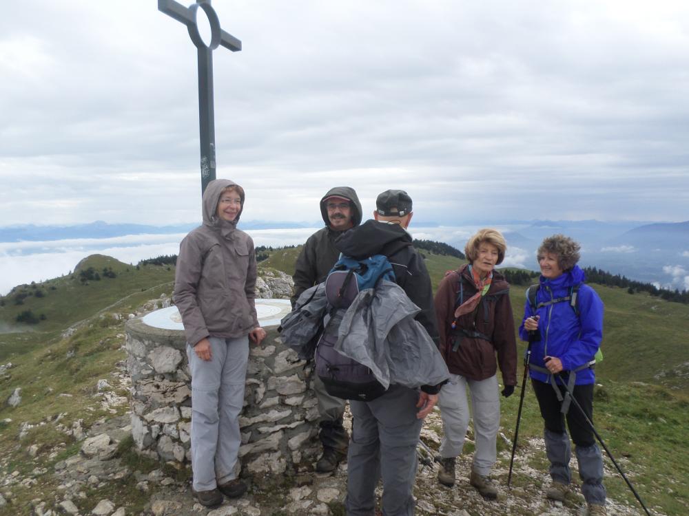 7 randonneurs au départ de Menthière pour la montée au Crêt de la Goutte . De la brume et un vent froid , mais malgré une légère alerte pas de pluie . Passage au chalet de Varambon , le Sorgia d'en haut et remontée à la croix du crêt de la Goutte , puis le chalet et col du Sac et redescente sur Menthière . Paysage noyé dans la brume assez épaisse dans les vallées avec juste le sommet de la chaine des Alpes qui émergent ainsi que les crêtes du Jura . Mais cette mer de brume donne un aspect assez spectaculaire au paysage .