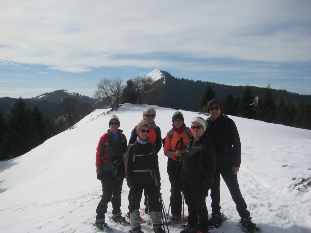 6 valeureux randonneurs étaient au rendez-vous pour notre sortie raquettes au Crêt de Chalam . Départ 9h45 raquettes aux pieds sous un ciel bleu , pas trop froid malgré un vent fort en rafale . La neige tenait bien sous nos pieds et nous arrivons rapidement à la Borne aux Lions . Le panorama est superbe sur la chaine du Jura . Nous décidons de continuer sur le Crêt aux Merles , arrivé en haut la vue est magnifique et le regard se porte jusqu'aux aiguilles d'Arves !!! Nous déjeunons au soleil à l'abri du vent ; puis nous rallongeons notre retour par les crêtes du Nerbier pour profiter de ce beau panorama et de notre grande forme .. Nous arrivons aux voitures à 16h ravis de notre très belle sortie et tenons à remercier la commune de la Pesse pour leur excellent balisage raquettes .