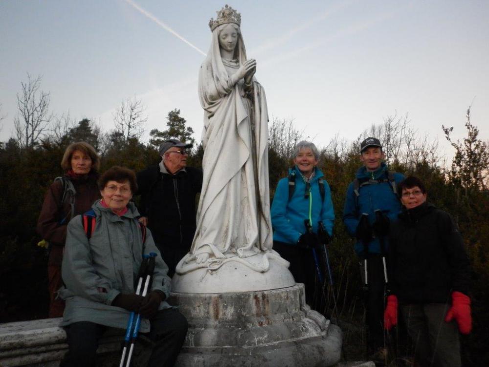 Après-midi froid, mais ensoleillé pour 18 randonneurs super motivés! Départ tranquille d'Arbent, vers une grande descente, suivie d'une très longue montée pour Sièges dans le Jura (où personne ne s'est assis, d'ailleurs). mais attention, la nuit tombe très vite en décembre! Donc retour rapide dans l'Ain, par la cabane des chasseurs et une petite visite à la belle vierge d'Arbent... puis le verre de l'amitié. Le tout orchestré de main de maitre par Lionel, nouvel accompagnateur de l'association .