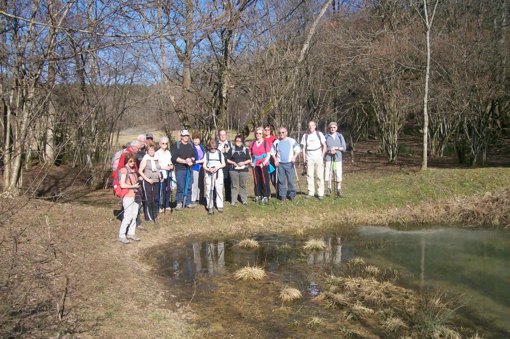 18 randonneurs au départ de NURIEUX en direction de PEYRIAT des puits Romain VIEILLAT beau site aménagé par l'association HISTORIA puis les monts BERTHIAND avec les belles vues sur le lac de NANTUA , LA CLUSE