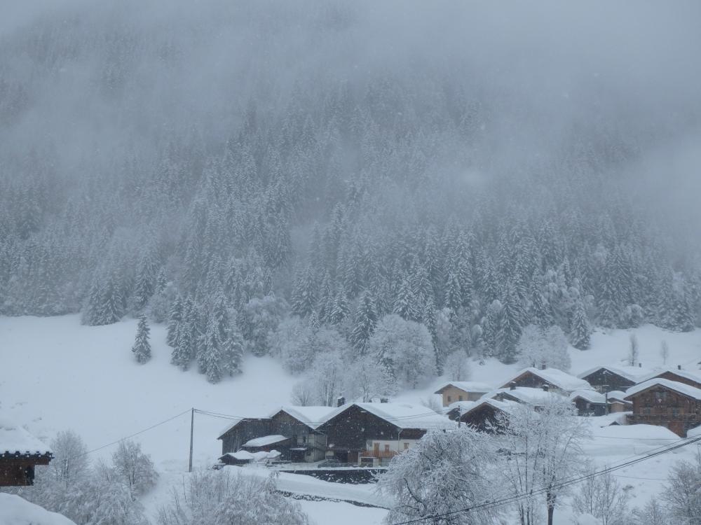 3ème et dernier jour. Départ d'Habère Poche pour les Mouilles, le temps est couvert. Arrivés au parking, nous décidons de faire une boucle autour du village et c'est sous la neige et dans le vent que nous effectuons notre parcours de raquette...De retour au départ, une partie des randonneurs vont se restaurer et quelques autres décident d'aller jusqu'à la petit chapelle en haut du village. Puis nous sommes contents de rentrer à l'abri pour manger notre casse-croûte.