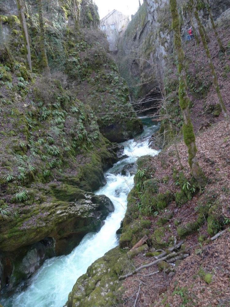 Retour au chalet pour le déjeuner, puis départ, avec arrêt aux gorges de la Langouette, profonde et eau bouillonnante. Comme nous n'étions pas loin des pertes de l'Ain nous nous y rendons.