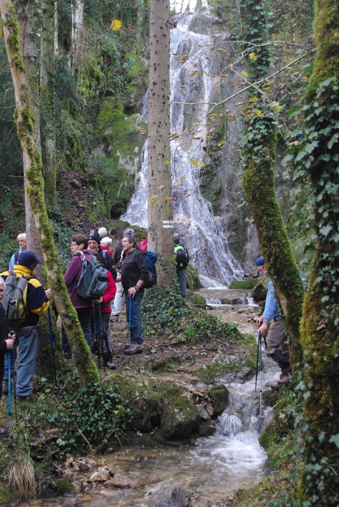 31 randonneurs ont pris le départ du parking d'IJEAN route de Groissiat pour monter dans les bois jusqu'au village de GEOVRESSET que nous traversons et descendons en direction de BELLIGNAT jusqu'à la carrière , ensuite nous traversons une forêt d'épicéa pour arriver à cette magnifique cascade avant de regagner le parking .