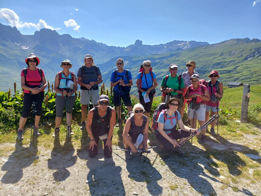 3ème jour, lundi – La crête du lac de Roselend via la roche Parstire en boucle, accompagnateurs : Sylvie et Juliette. Départ du col du Pré par une route très sinueuse, étroite et vertigineuse. Deux groupes au départ du même circuit, direction la roche Parstire par un chemin boisé à forte pente, mais régulière. Nous arrivons aux pieds des roches avec une vue magnifique sur le lac de Roselend. Nous reprenons notre ascension, arrivée au sommet, un chemin en crête nous conduit au passage « Charmette ». Là les deux groupes se séparent, l’un pour redescendre directement et l’autre pour aller vers les « Acrays » par la Faitaz où nous traversons un très beau troupeau de Tarines. Pose repas en surplombant le lac de St Guérin. Nous regagnons les voitures par les « ravines rouges » et le sentier « découverte ».