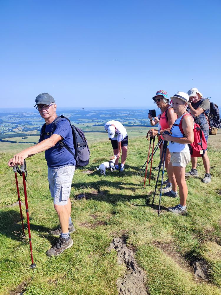 5ème jour : mercredi 02 juillet. Rando La Banne d’Ordanche et la Borne des 4 Seigneurs, rando raccourcie à cause des fortes chaleurs attendues. Départ du refuge de la Banne pour 16 randonneurs. Nous arrivons au col de Saint Laurent par un large chemin où nous entendons les alouettes des près, puis montée de la Banne d’Ordanche (1512m) par un sentier bien aménagé. Retour sur nos pas jusqu’au col puis montée et traversée en crêtes jusqu’à la borne des 4 seigneurs avant d’atteindre le Puy Loup où nous avons encore une vue magnifique à 360°. Petit temps de contemplation … Nous nous dirigeons ensuite, à l’écart du sentier balisé, pour le pique-nique. Retour au départ à une bonne allure… Arrêt au refuge où nous apprécions l’accueil de Paulo et son équipe pour des rafraichissements et pour faire la photo souvenir avec Paulo. Retour libre au VTF. Petite rando avec Jean Paul (3 personnes).