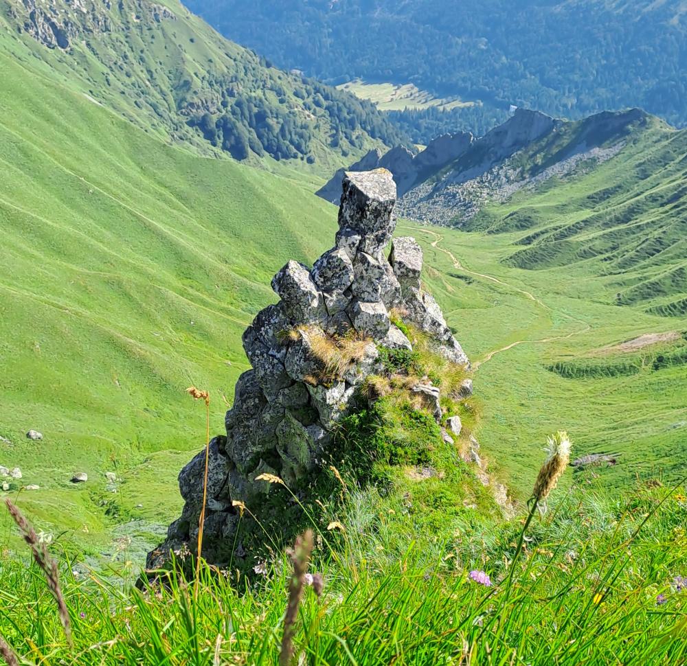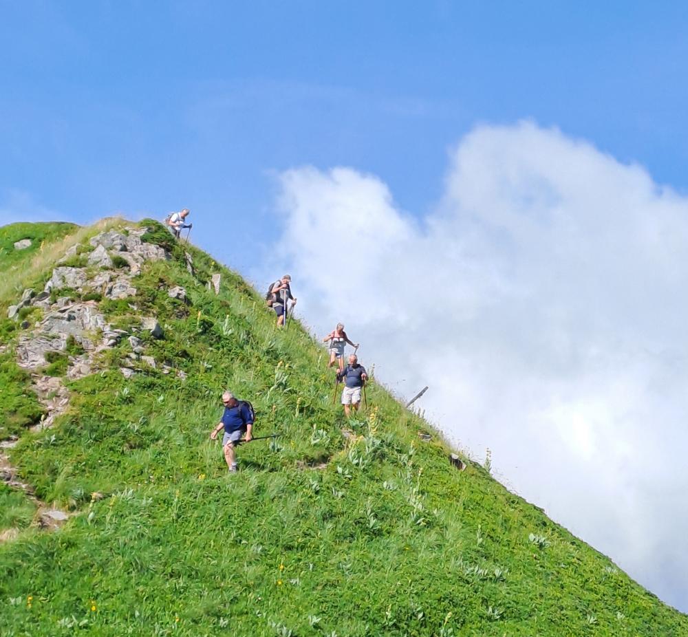 COMPTE RENDU du vendredi 04 juillet 2025 : LE PUYS DE SANCY AU DÉPART DE CHASTREIX. UN MAJESTUEUX VOLCAN… Une randonnée de 15,5 km – 760M de dénivelé (environ). Au départ de la station de Chastreix, nous évoluons en, alpage. A 1738 m d’altitude, un arrêt photos prés du rocher dit « la tour Carrée » s’impose. Nous suivons les crêtes marquées par « le Pas de l’Âne » pour arriver sur un parcours aménagé de larges escaliers en bois, nous conduisant au sommet du Puys de Sancy à 1885m d’altitude. PUYS DE SANCY ; Point culminant du Massif Central, il est plus haut volcan de la France métropolitaine, situé au cœur de trois réserves naturelles nationales, lui permettant la préservation des paysages, d’une faune et d’une flore remarquable. °°°°De cette hauteur, nous apprécions une vue imprenable, à 360 degrés sur la chaîne des Puys, les Mont du Cantal et du Forez. Une descente raide, jusqu’au « Col de la Cabane » Le pique nique est le bienvenu. Nous poursuivons en prairie, au milieu de fleurs abondantes… gentianes prêtes à éclore… Pour terminer, une montée, éprouvante pour certains tant la chaleur nous envahit. Le soir, nous laissons vêtements et chaussures de randonnée pour nous retrouver au restaurant à Saint Sauves d’Auvergne. Un accueil chaleureux, des mets excellents et copieux étaient au rendez vous ! Certains choisirent la spécialité régionale : la truffarde. Un plat originaire d’Auvergne à base de pomme de terre, tome fraîche, accompagné de jambon fermier et salade. °°°° Une soirée fort sympathique pour clôturer notre séjour. Demain, nous rentrerons, impressionnés, les yeux éblouis par les paysages d’Auvergne.