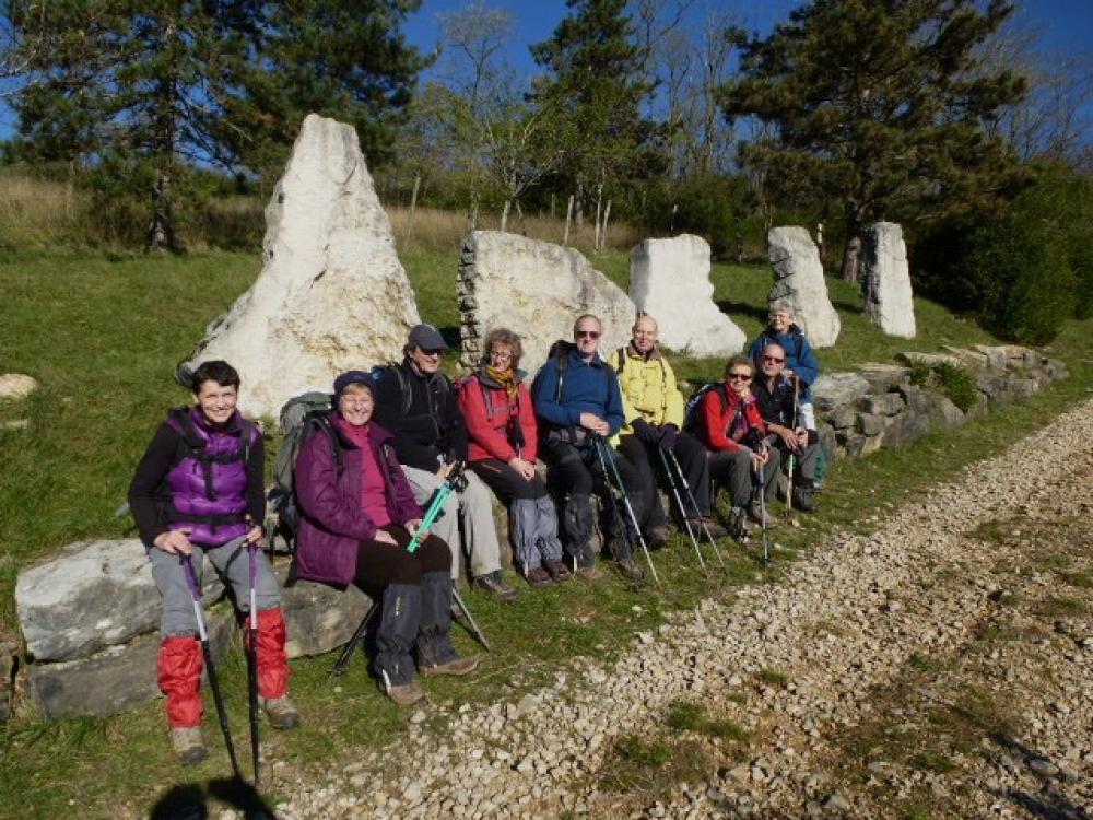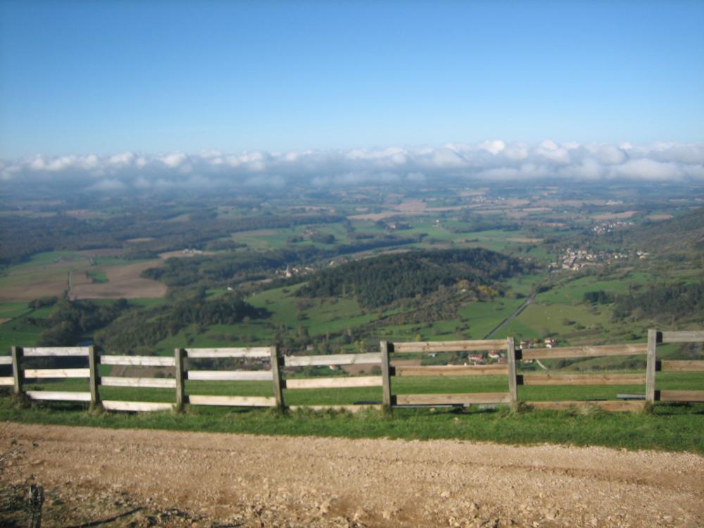 Très fraiche cette randonnée d'Automne . Dix randonneurs au rendez-vous pour une montée soutenue de Cuisiat à la Chapelle de Montfort puis en balcon vers Pressiat . Le soleil nous a rejoint sur les pentes du Mont Myon . Très belle vue sur la Bresse d'un coté et de l'autre sur la chaine du Jura , les Alpes et le Mont-Blanc . casse-croute au refuge ou quelqu'un avait eu la bonne idée d'allumer un feu que nous avons ravivé . descente vers le sentier mémoire des Pierres sous la bise et le soleil . Randonnée bien sympathique .