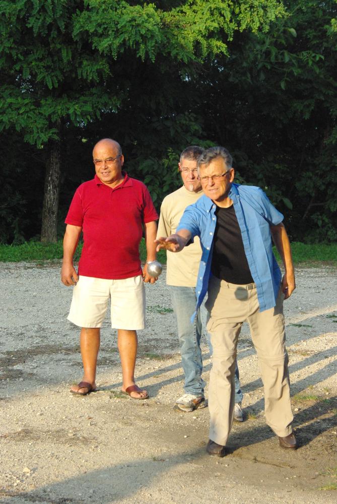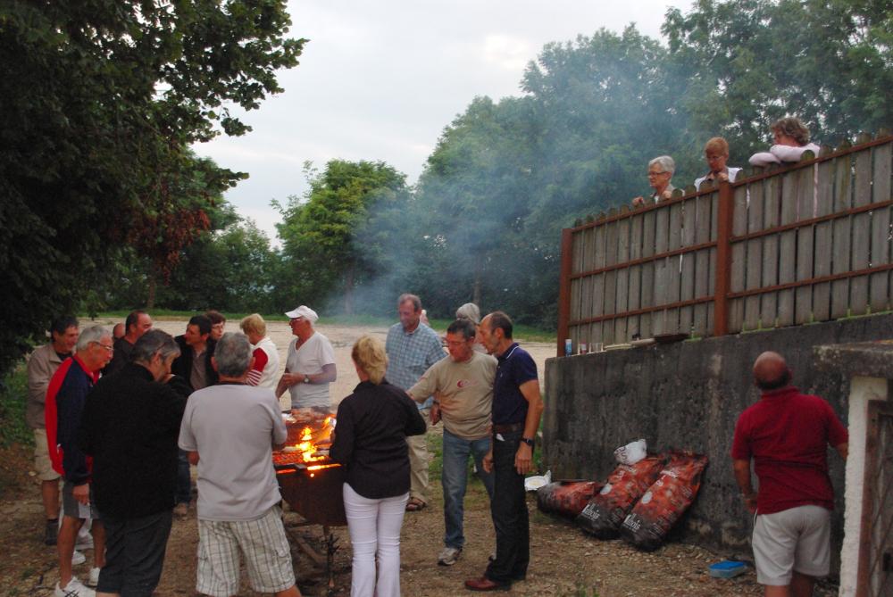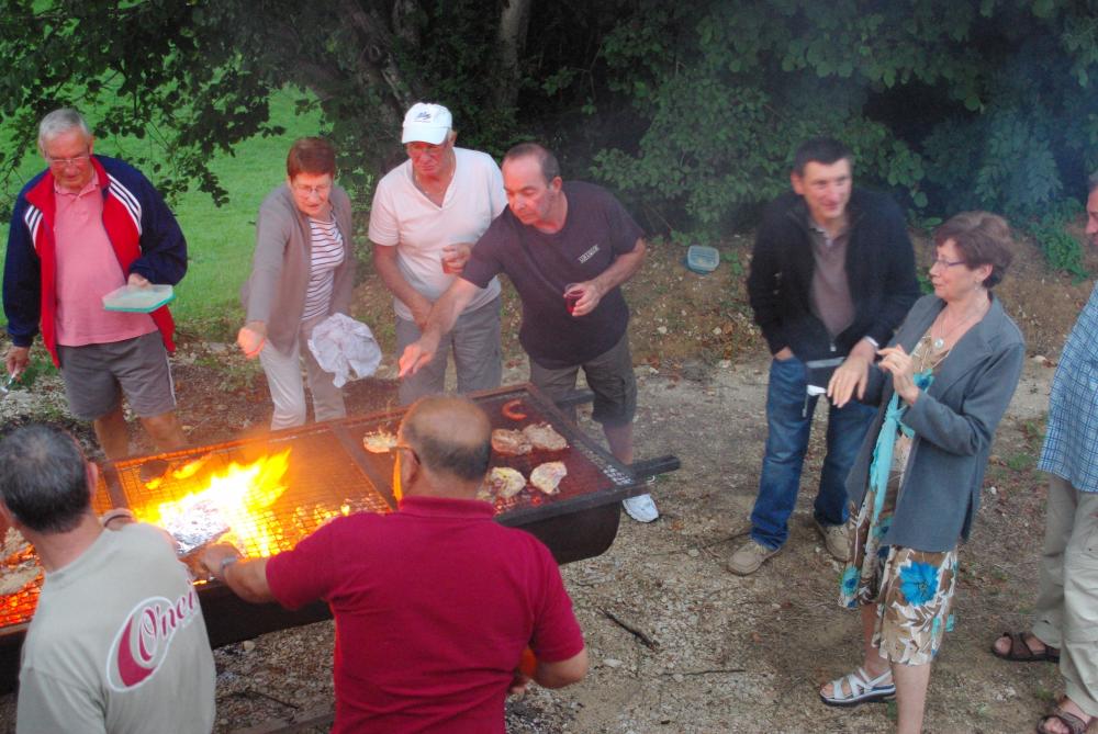 Comme c'est la coutume depuis quelques années ce vendredi c'était notre soirée détente . En début d'après-midi , une petite randonnée était organisée , suivie pour certains d'une partie de pétanque , pendant que d'autres papotaient , vers 19 h c'était l'heure de l'apéro et la préparation du feu ou dans une chaude ambiance chacun fit cuire côtelettes et saucisses , puis nous nous rassemblons dans la salle des fêtes pour déguster les plats que chacun a apporter dans une belle convivialité . Si certains ont les yeux rouges sur les photos c'est surtout dû à la fumée!!!!