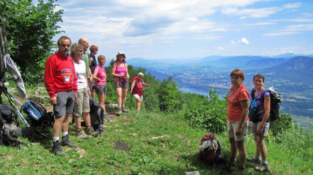 10 randonneurs au départ. La 1ère partie de la montée s'est faite dans les pâturages avec plusieurs vues sur le Lac d'Aiguebelette. Le reste de la montée s'est effectuée dans la forêt. Une pierre gravée d'une Croix de Malte, datant du 16ème siècle, marque la fin de la montée.Nous avons eu le plaisir de découvrir 2 points de vue : Croix du Signal avec vue sur le lac du Bourget, Aix-les-Bains.... et le belvédère du Chateau Richard avec vue sur le Lac d'Aiguebelette, la Chartreuse...Après le passage de 3 échelles, sans difficulté, le groupe prend la descente. Nous avons eu très chaud malgré le parcours en majorité dans la forêt.
