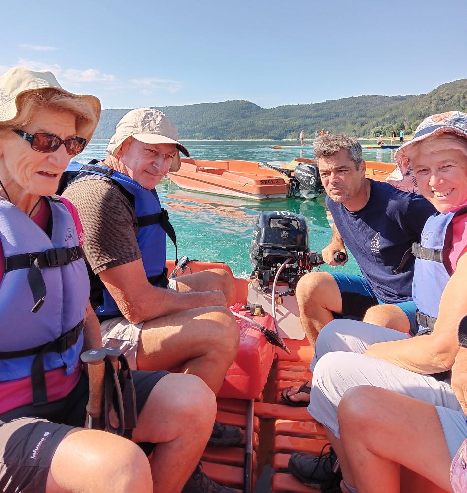 C'est par une belle journée d'été que nous avons pris le bateau à Bellecin pour la traversée en direction de la plage du Parchet. Nous traversons Maisod et arrivons au belvédère de la Braise avec vue sur la petite île. Notre botaniste, Annie, nous a fait découvrir le cyclamen de montagne qui embaumait le chemin. Un petit peu de soleil jusqu'au Pont de la Pyle où nous déjeunons,et une glace au resto à côté. Nous prenons le sentier de l'autre côté du pont et nous suivons la rivière jusqu'au belvédère de Château Richard avec vue sur le pont et l'île. Petit passage au soleil et nous arrivons à Bellecin tous contents de cette agréable balade.