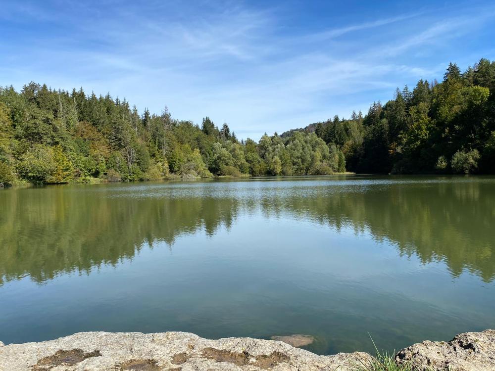 ** Cheminant toujours en sous-bois, nous atteignons le belvédère de la « Scia » site naturel classé, à 800m d’altitude, offrant un superbe panorama sur la chaîne du haut jura.